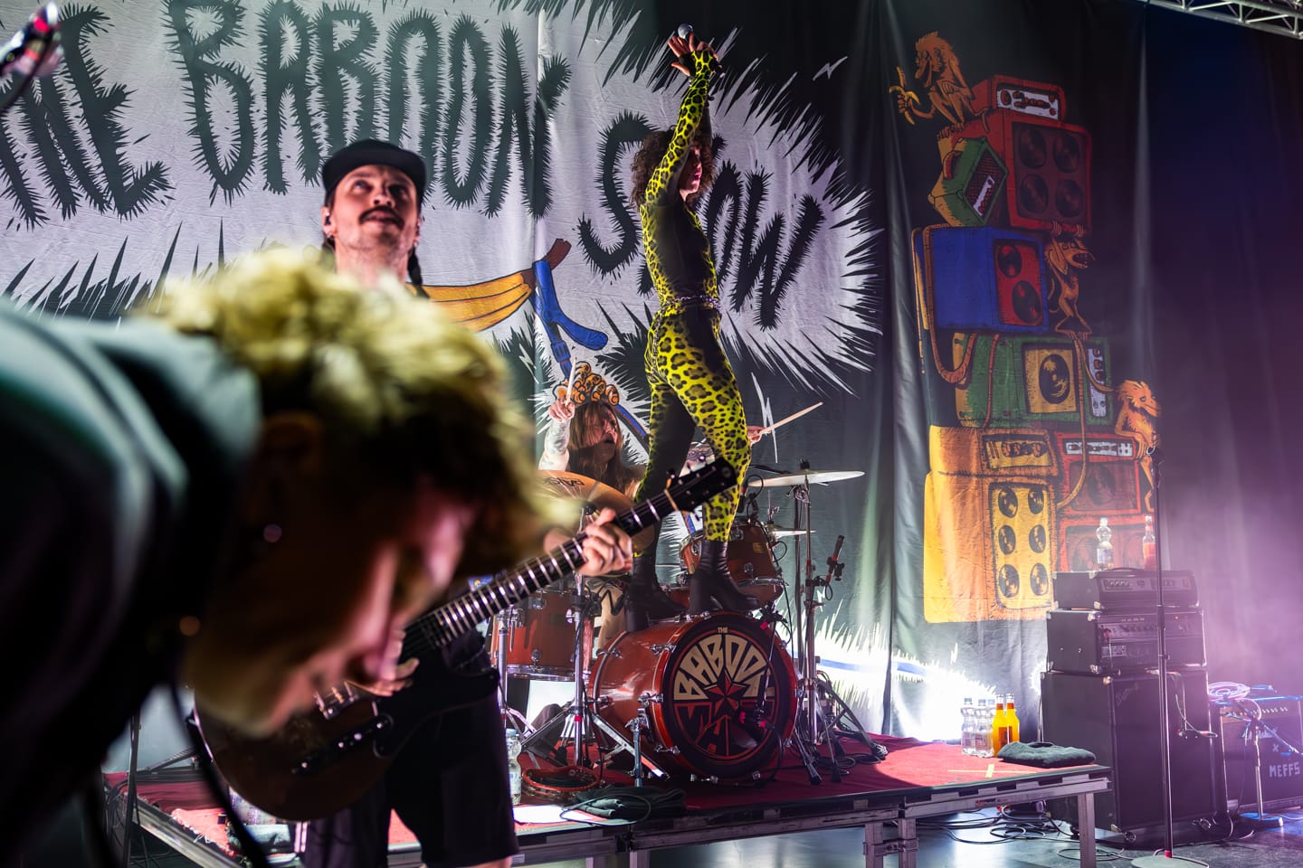 Als der besagte fünfte Song begann, stieg mein Puls. Ich hatte mir mühsam einen Winkel erarbeitet, von dem aus ich die Bassdrum im Visier hatte. Doch die Realität einer Punk-Show schert sich nicht um deine Planung. Simon Dahlberg, der Gitarrist der Baboon Show, machte die Bühne zu seinem Wohnzimmer. Er tanzte, wirbelte und blockierte mir permanent die Sicht auf Cecilia.